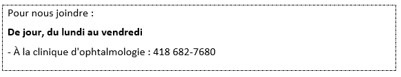 En cas de baisse significative de la vision ou d’une perte de champ visuel, veuillez nous contacter ou vous rendre à l'urgence de l'hôpital afin d'être suivi le plus rapidement possible.