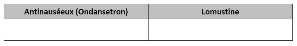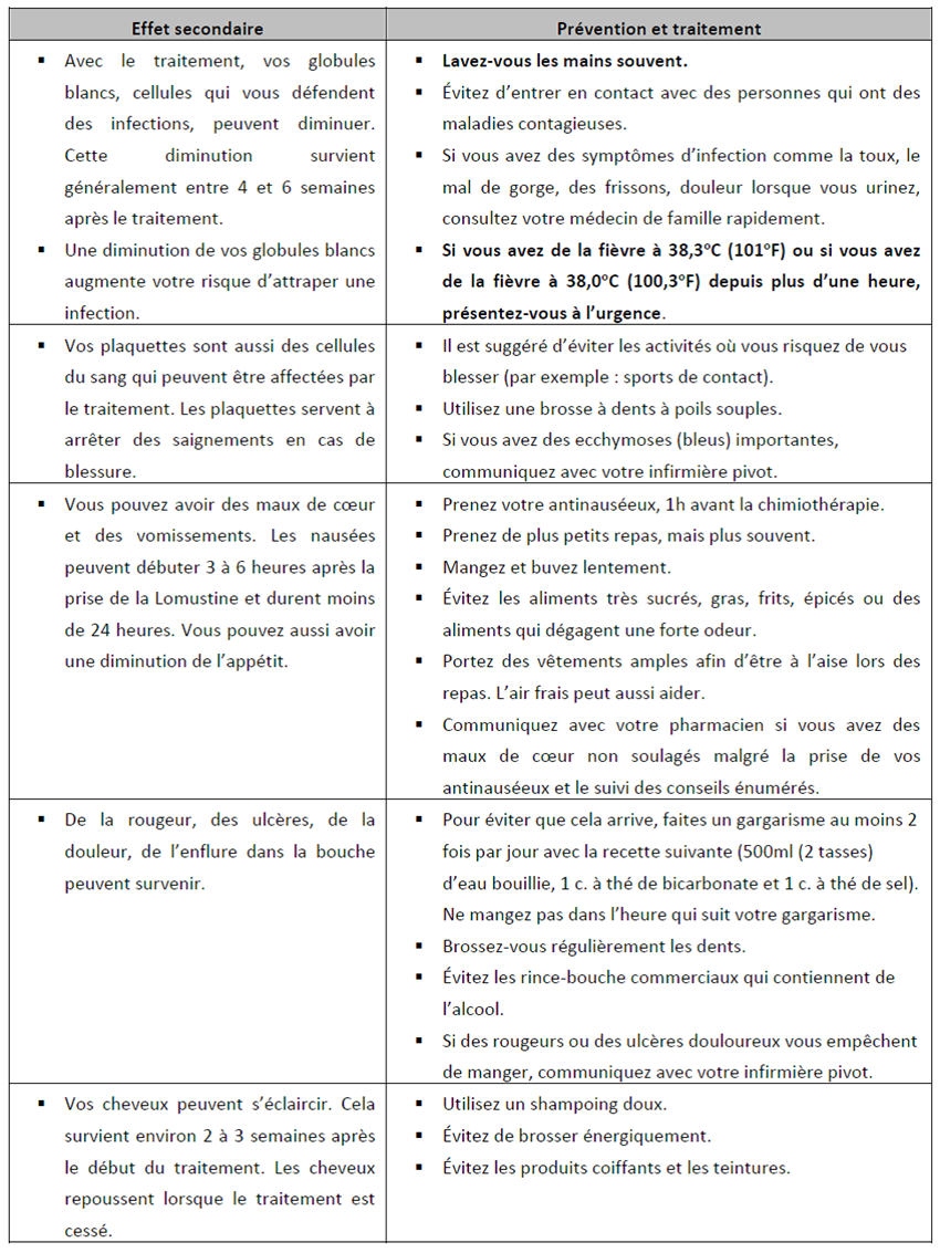 Il n’y a pas beaucoup d’interaction avec la Lomustine. Toutefois, avant de prendre un médicament sur les tablettes ou un produit naturel, vérifiez auprès de votre pharmacien.
