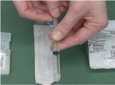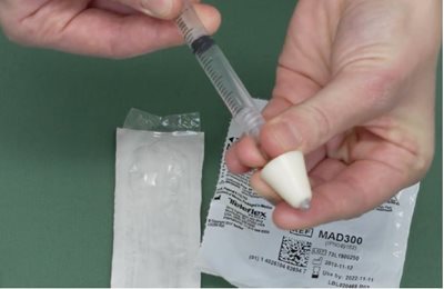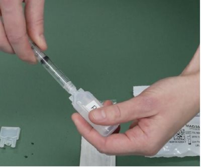2. Tenir la seringue qui contient le médicament et le dispositif intranasal avec une main.