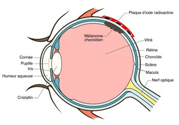 La curiethérapie est utilisée pour le traitement du mélanome de la choroïde. Ce traitement consiste à placer, pour une courte période de temps (généralement 3 jours), une plaque contenant des sources radioactives au contact de la lésion. Chaque source mesure environ 5 mm de long et 1 mm de diamètre (de la taille d’un grain de riz) et la plaque en contient de 9 à 21 selon les cas. Le chirurgien attache la plaque sur la sclère de l’œil de façon à recouvrir la tumeur.
