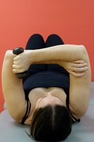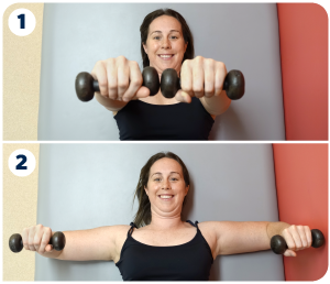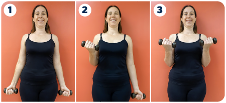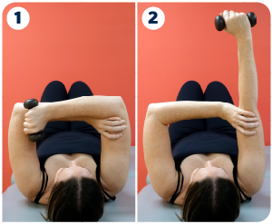 Couché sur le dos, genoux fléchis, un poids dans la main du côté opéré. Placer le bras du côté opéré à la verticale vers le plafond, paume vers vos pieds. Tenir ce bras en bas du coude avec l’autre main. Plier le coude du côté opéré pour apporter le poids vers l’épaule opposée.