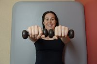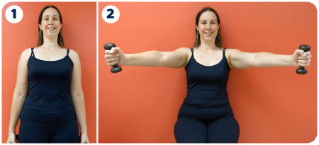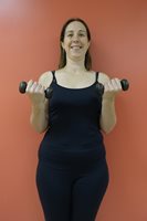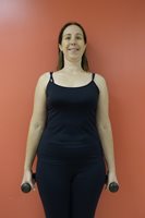 Debout ou assis avec le dos bien droit, bras le long du corps, paumes vers vous. Tenir un poids dans chaque main.