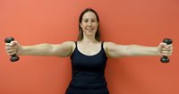 Couché sur le dos, genoux fléchis, bras écartés en T avec les coudes pliés à 90°, un poids dans chaque main.