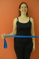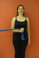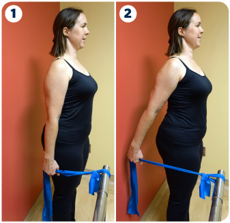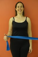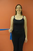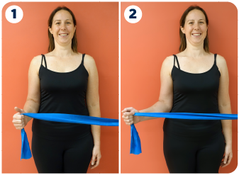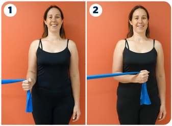 Fixer un élastique sur une poignée de porte ou à un objet fixe devant vous. Debout, bras du côté opéré allongé le long du corps, paume vers vous, tenir l’élastique dans votre main.