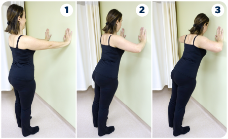 Debout, face à un mur, à une distance d’une longueur de bras. Appuyer vos mains sur le mur à la hauteur des épaules avec les bras écartés légèrement plus que la largeur des épaules.