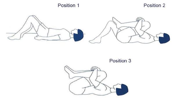 Couché sur le dos, les genoux pliés et les pieds à plat au sol (voir position 1). À l’aide des mains, amenez une première jambe sur l’abdomen (position 2) puis la deuxième jambe (position 3). Il est important de monter une jambe après l’autre sur l’abdomen et, redescendre une jambe après l’autre au sol à la fin de l’exercice.