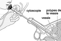 L’ablation de tumeur de la vessie par cystoscopie : l’urologue insère par l’urètre un instrument (cystoscope) lui permettant d’atteindre la vessie. Cette intervention peut être faite sous anesthésie générale ou régionale. Elle dure en moyenne de 30 à 60 minutes. Il s’agit, la plupart du temps, d’une intervention d’un jour.