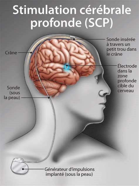 La stimulation cérébrale profonde consiste à envoyer des impulsions électriques, à travers des électrodes, dans une zone précise du cerveau.