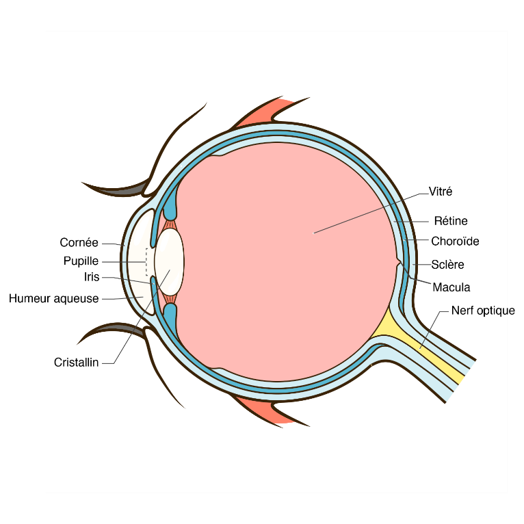 - Pupille : Ouverture circulaire au centre de l’iris qui laisse passer la lumière jusqu’à la rétine.