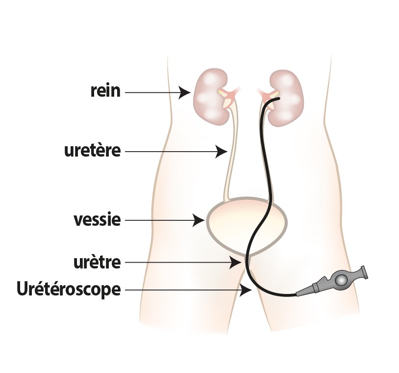 L’urétéroscopie est utilisée pour enlever des calculs urinaires (pierres) dans le rein ou dans l’uretère. Un urétéroscope est placé dans l’urètre puis il remonte dans l’uretère pour examiner et pour retirer les pierres. Parfois, un tube de plastique (Double J) est temporairement installé dans l’uretère pour prévenir un blocage pendant la période d’inflammation postopératoire. Ce tube sera retiré habituellement après quelques jours ou quelques semaines.