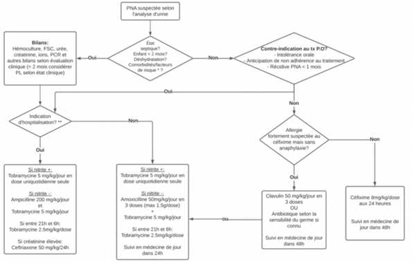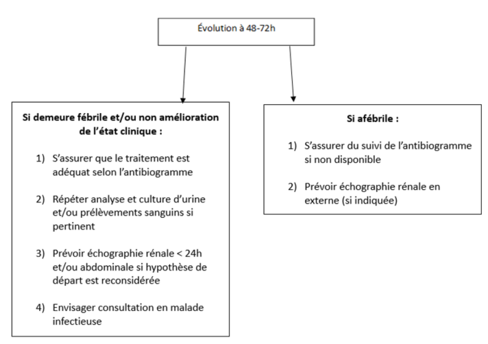 Les études démontrent que le risque d’atteinte rénale permanente causé par une PNA est très faible chez les enfants avec des reins normaux. Une analyse Cochrane chez les enfants de 1 mois ou plus démontre que l’évolution de la fièvre et le risque d’atteinte rénale sont les mêmes que le traitement soit par des antibiotiques PO dès le diagnostic ou qu’il soit avec des antibiotiques IV initialement suivi d’un relais PO.