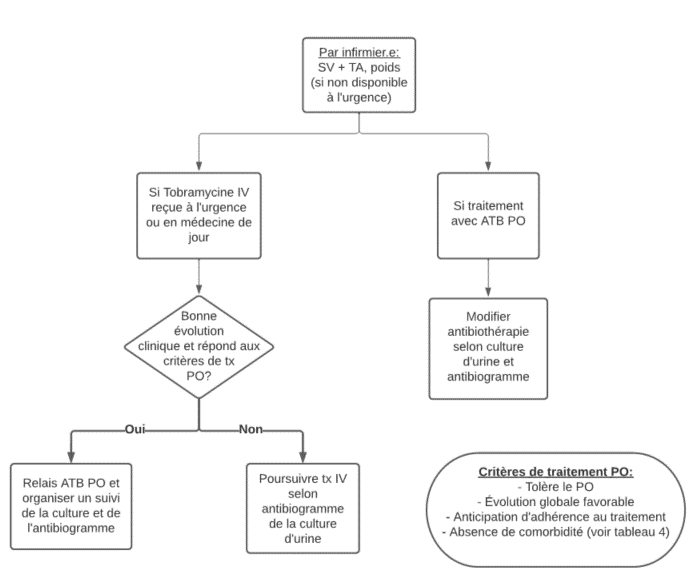 Par contre, les patients avec comorbidités ou facteurs de risque devraient être traités par voie IV initialement à la suite du bilan sanguin, et un relais PO pourra être organisé selon l’évolution.