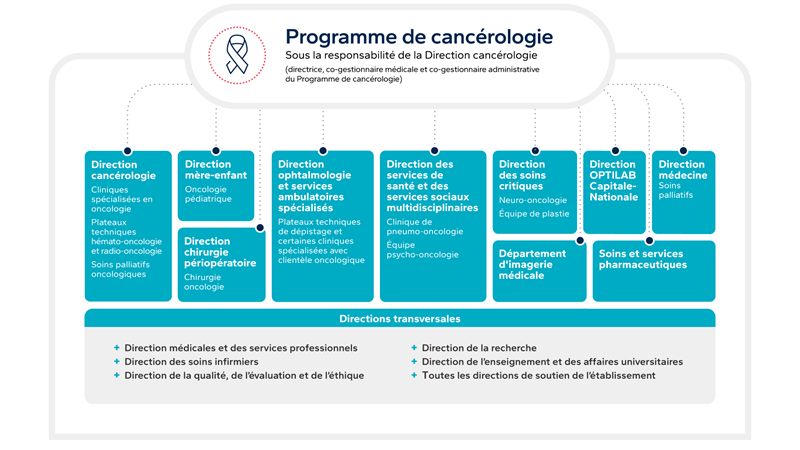 Le programme de cancérologie est sous le leadership de la Direction cancérologie. Il offre des soins et services généraux, spécialisés et surspécialisés, couvrant tout le continuum des soins en oncologie : du dépistage au traitement, en passant par la survie et les soins palliatifs.