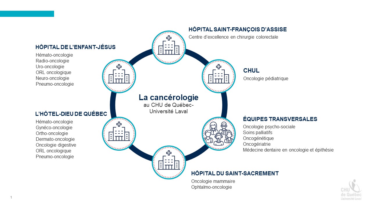 Une proportion significative de cette activité est concentrée sur les unités de soins d'oncologie de L'Hôtel-Dieu de Québec (L’HDQ) et de l’Hôpital de l’Enfant-Jésus (HEJ), tandis qu'une grande partie des activités ambulatoires se déroule au Centre intégré de cancérologie de HEJ (CIC-HEJ) et au Centre de recherche clinique et évaluative en oncologie (CRCEO).